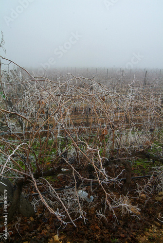 Vista con niebla durante el invierno de viñedos de Toro, Zamora, Castilla y León.