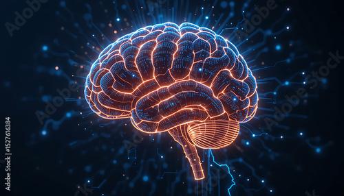 Visual representation of an illuminated brain showcasing neural connections and electrical activity at night