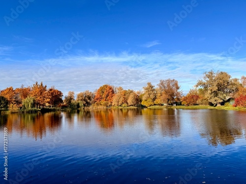Vivid autumn trees reflection on the lake surface in the park, blue sky and pure calm blue water, golden fall