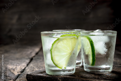 Vodka shots with lime and ice on the board.