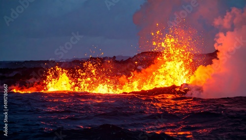 Volcanic Eruption into Ocean: Fiery spectacle of lava meeting the sea at night