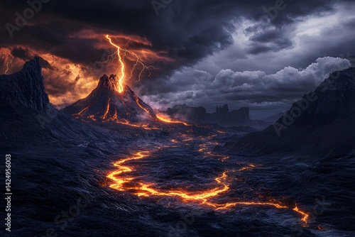 Volcanic eruption with lightning strikes and lava flow under a stormy sky in a mountain range
