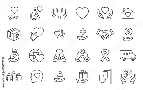 Volunteering and charity web icons in line style. Donate, donor, doctor, care, help, support, collection. Vector illustration.