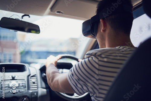 VR, man and driving in car with headset for augmented reality, metaverse and futuristic transport. 3D goggles, driver and person with digital streaming for simulation, virtual experience and gaming