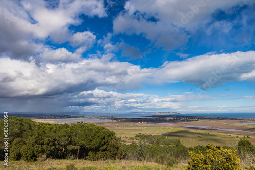 Vue sur la Réserve Naturelle du Bagnas et, au loin, sur le Mont Saint-Clair, par un temps nuageux depuis le Mont Saint-Loup à Agde