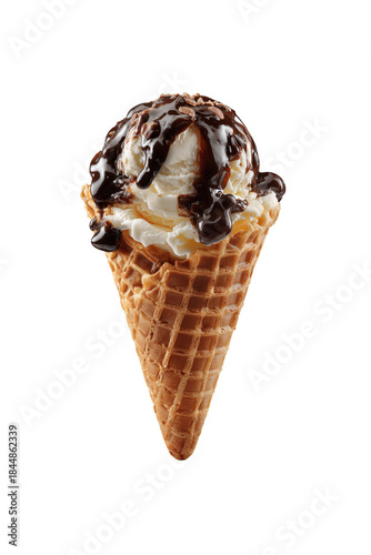 Waffle cone with ice cream and chocolate sauce