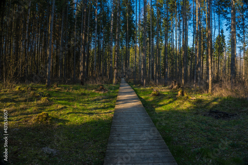 Walking path in raised bog nature trail through pine forest