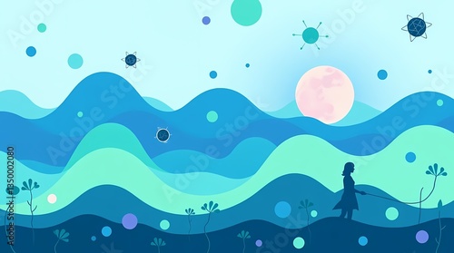Wandering Under the Moonlit Sky: An imaginative illustration of a silhouetted person in a whimsical landscape. Waves of color dance across the scene under the warm.