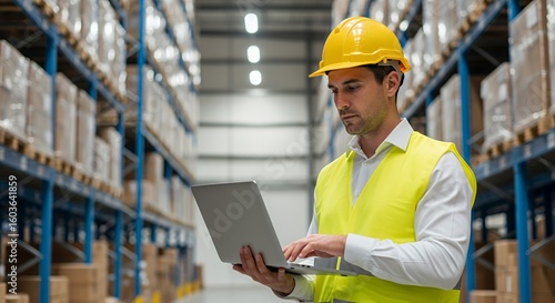 Warehouse Manager Using Laptop, Inventory Management in a Modern Logistics Center