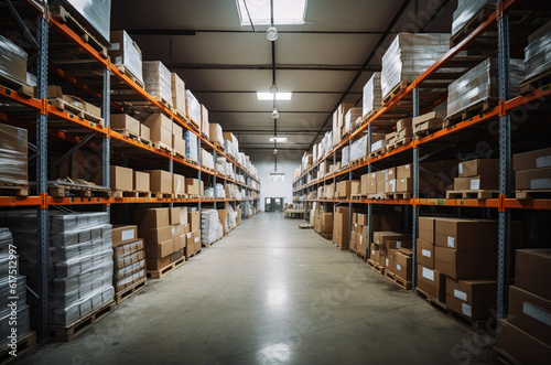 Warehouse with shelfs, carboard boxes and products. Generative AI.