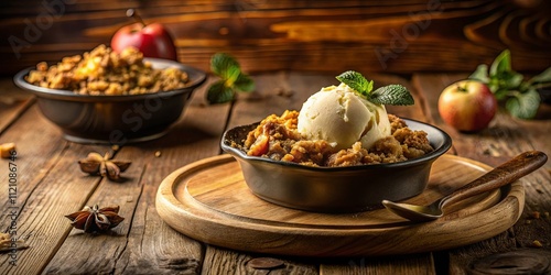 Warm Apple Crumble Dessert with Vanilla Ice Cream, Served in Rustic Bowls on Wooden Board
