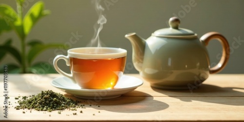 Warm, Aromatic Tea in a Cozy Setting A steaming cup of tea, a nearby teapot, and loose tea leaves scattered on a sunlit wooden surface