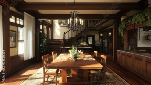 Warm Craftsman-style dining space, showcasing a wooden table and chairs, highlighted by a detailed iron chandelier.