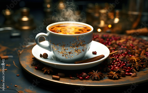 Warm cup of coffee with intricate latte art surrounded by roasted coffee beans in a cozy setting