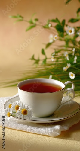 Warm cup of tea, surrounded by daisies and greenery