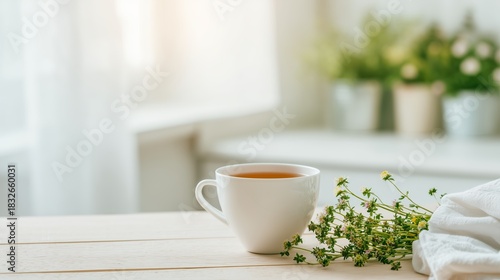 Warm cup of tea with fresh herbs on a bright table setting in a cozy room