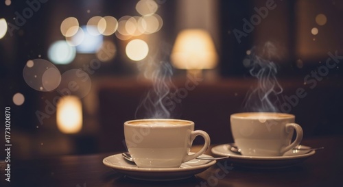 Warm cups of coffee on a cozy table in a softly lit cafe during evening hours with gentle steam rising