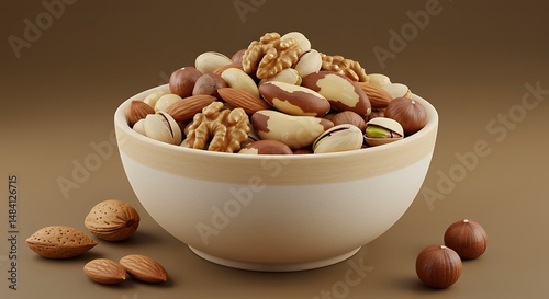 Warm Hues and Textured Delight: A 3D Render of Mixed Nuts in a Ceramic Bowl