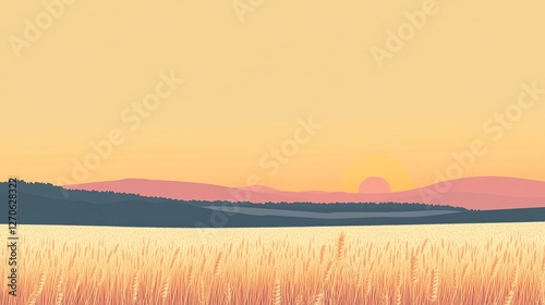 Warm hues envelop the serene landscape with golden wheat and distant mountains during a tranquil sunset in the countryside