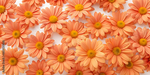 Warm orange daisy blooms densely arranged on light surface with bright yellow centers forming vibrant floral display