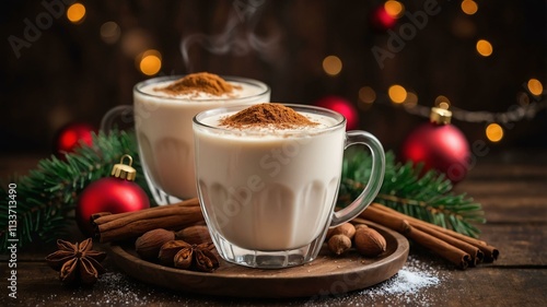 warm spiced milk with nutmeg served on a wooden table with Christmas theme