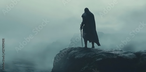 Warrior stands atop a cliff in a mysterious misty landscape