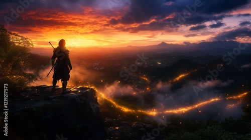 Warrior's Sunset Vigil: A lone figure stands on a cliff overlooking a breathtaking sunset over a valley illuminated by city lights, a scene of serene power and mystery.