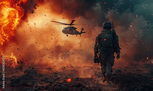 Warzone destruction panorama with smoke, fire, and military chopper waiting for extraction. illustration images
