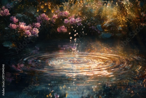 Water droplet falling into a magical floral pond
