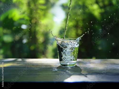Water pours into a glass, creating a splash against a lush green, blurred background. Sunlight reflects on the surface.