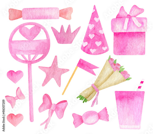 Watercolor Birthday party set. Hand drawn bright pink party hat, paper cup, cake topper, kid crown, flower bouquet, flag, hearts and bows isolated on white background. Clipart for girls birthday card.