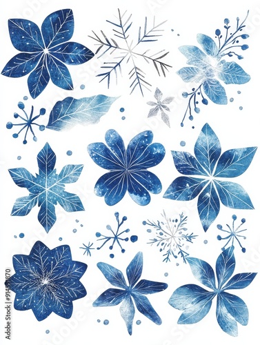 Watercolor Blue Floral Design with Snowflakes