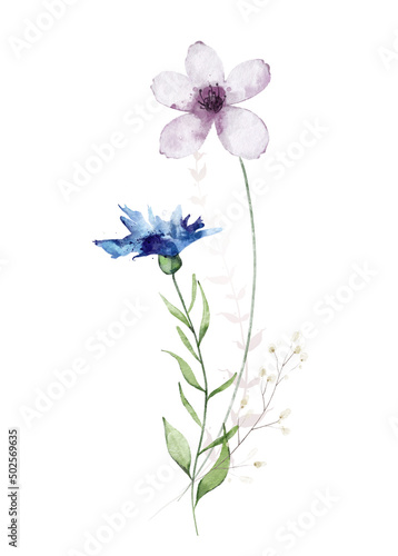 Watercolor bouquet with wild violet and blue flowers, branches, leaves, twigs. Hand drawn floral illustration