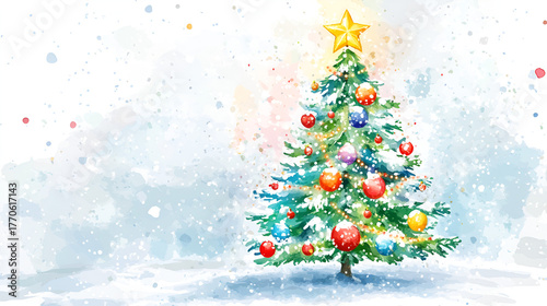Watercolor Christmas tree with star and ornaments festive holiday illustration for greeting cards invitations and seasonal designs