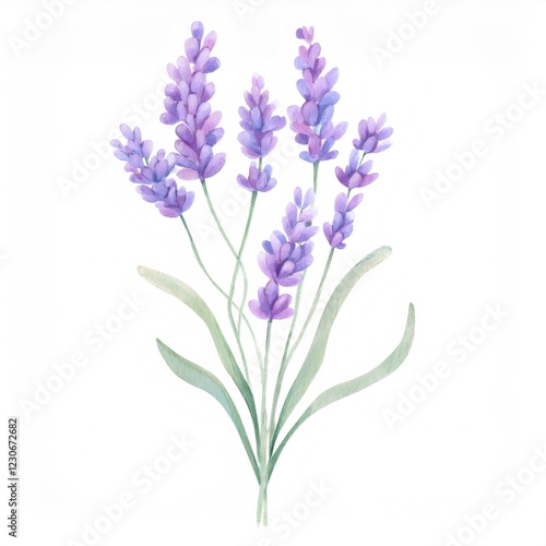 Watercolor depicting delicate lavender bouquet, vibrant purple blossoms and verdant leaves presenting soft, aromatic landscape in gentle brushstrokes