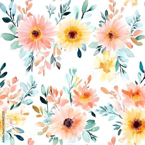 Watercolor Floral Pattern with Peach and Yellow Flowers