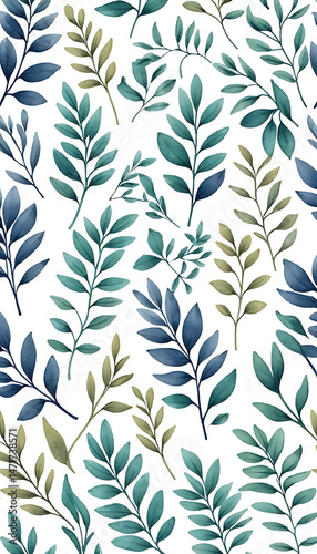 Watercolor Foliage Pattern With Teal And Olive Green Leaves Isolated On White Background Botanical Seamless Design