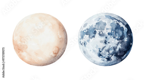 Watercolor full moon pair illustration, featuring detailed depictions of two moons in warm and cool tones, creating a celestial artwork. Isolated on transparent background, png.