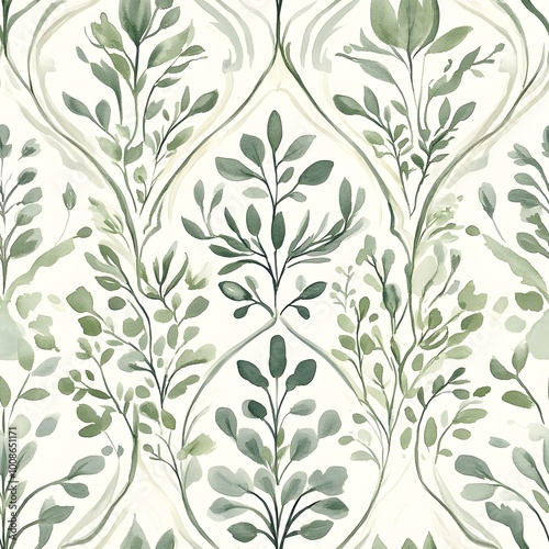 Watercolor Green Leaves Damask Pattern Seamless Repeat
