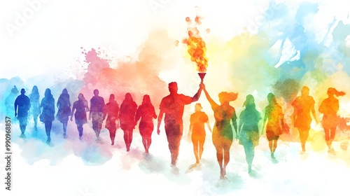 Watercolor Hand Holding Torch Leading Group Towards Bright Success and Hope