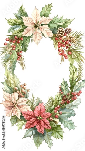 Watercolor illustration forms an elegant oval holiday wreath arrangement with colorful blooms and natural elements