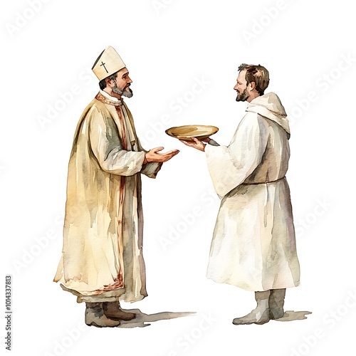 Watercolor Illustration of a Bishop and a Monk Exchanging a Plate.