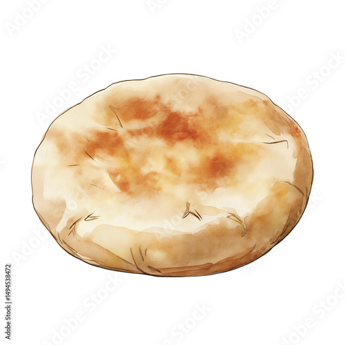 Watercolor illustration of a fluffy round pita bread, freshly baked with a soft, airy texture, painted with soft blended colors and artistic brush strokes, isolated on a clean white background.