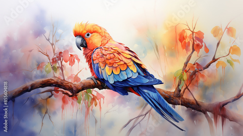 Watercolor illustration of a Parrot perched on a branch with natural background.