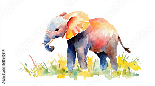 Watercolor illustration of colorful elephant standing in grassy field, showcasing vibrant hues and artistic brush strokes