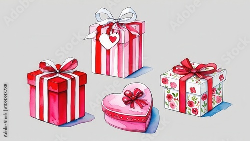 Watercolor Illustration of Four Beautifully Wrapped Gifts Red Pink and Floral Designs