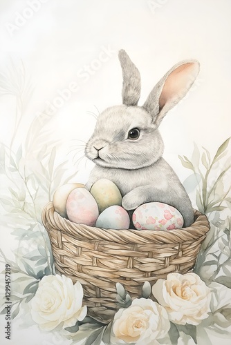 Watercolor illustration of grey bunny in wicker basket with Easter eggs and white roses.For design, print, wallpaper, poster, interior, advertising, banner.With place for text.