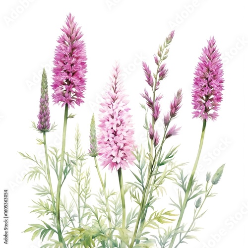 Watercolor illustration of Liatris spicata flowers in shades of pink, violet. Known as dense blazing star prairie feather, tall plants feature intricate blooms on white background. Vibrant floral