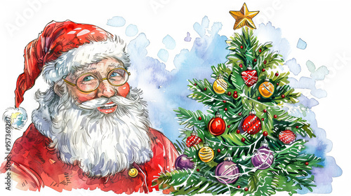 Watercolor Illustration of Santa Claus Decorating Christmas Tree with Colorful Ornaments. Concept of Holiday Cheer, Festive Celebration, Winter Joy