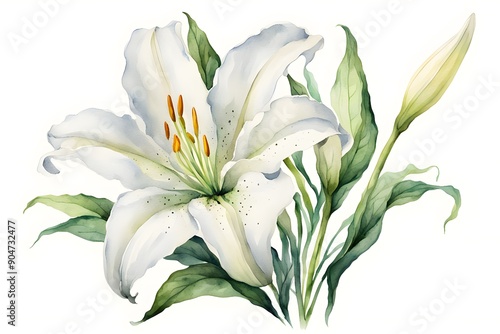 Watercolor madonna lily flower white background, Ai generated